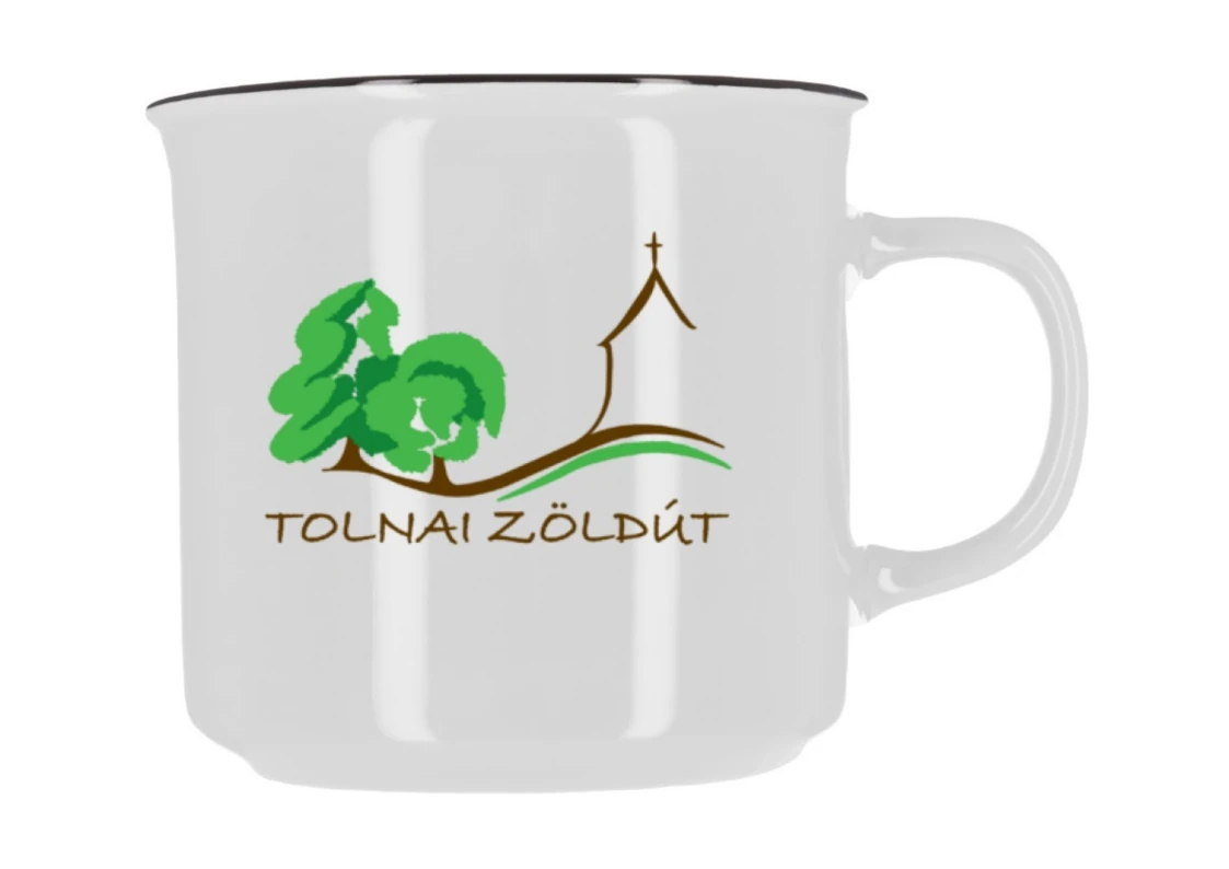 Bögre (2900 Ft, fehér zománcozott fém, Tolnai Zöldút logóval)